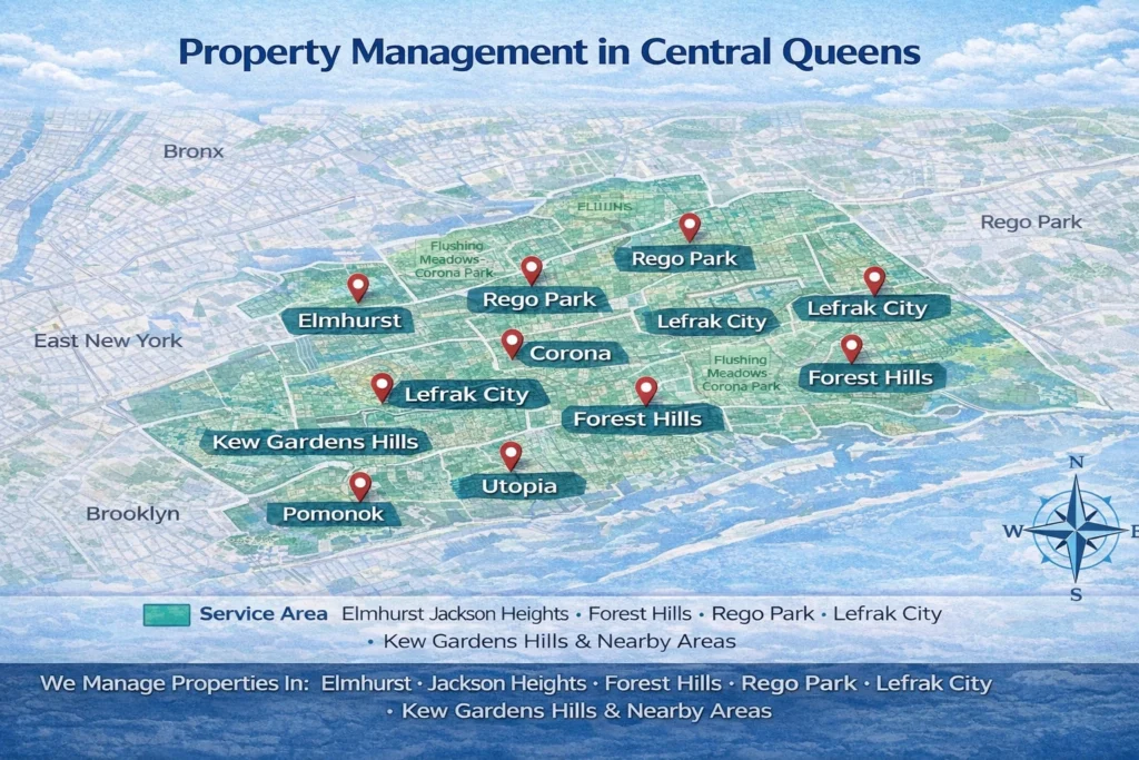 We provide property management services throughout Central Queens, including Forest Hills, Rego Park, Lefrak City, Hillcrest, Pomonok, Utopia, Kew Gardens Hills, Queensborough Hill, Elmhurst, Corona, Jackson Heights, North Corona, and surrounding neighborhoods.