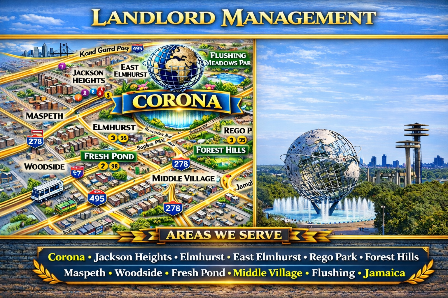 Landlord Management provides full-service property management throughout Queens, including Corona Property Management, Jackson Heights Property Management, Elmhurst Property Management, East Elmhurst Property Management, Woodside Property Management, Rego Park Property Management, Forest Hills Property Management, Sunnyside Property Management, and nearby Queens neighborhoods.
