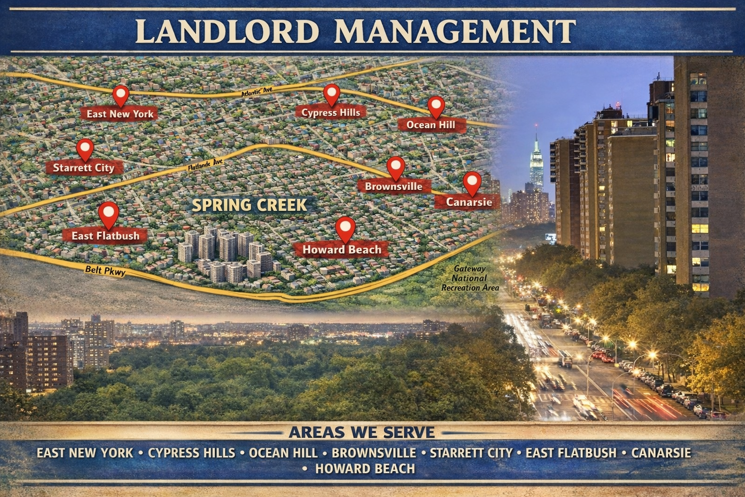 Spring Creek is one of Eastern Brooklyn’s most distinct service areas—newer developments, major retail corridors, waterfront-adjacent routes, and steady rental demand tied to convenience and access. Landlord Management provides full-service property management in Spring Creek and surrounding neighborhoods such as Starrett City Property Management, East New York Property Management, Canarsie Property Management, and City Line Property Management—with structured leasing support, consistent rent collection workflows, responsive maintenance coordination, and clear owner reporting.